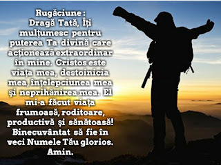 Dragă Tată, Îţi mulţumesc pentru puterea Ta divină care acţionează extraordinar în mine. Cristos este viaţa mea, destoinicia mea, înţelepciunea mea şi neprihănirea mea. El mi‑a făcut viaţa frumoasă, roditoare, productivă şi sănătoasă! Binecuvântat să fie în veci Numele Tău glorios. Amin.